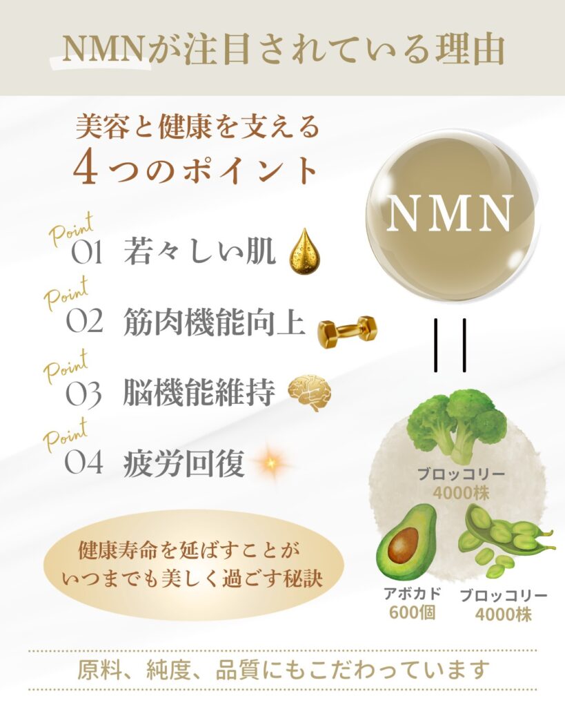 細胞の中でエネルギーを作り出すミトコンドリアは、内側からの美しさをサポートする土台と考えられており、肌の明るく美しい印象づくりに関わる存在として注目されています。そのミトコンドリアの働きを助け、現在美容でも注目されている成分がNMNです。NMNはもともと体内で産生されていますが40代をピークに体内での産生量が半減し、老化や身体機能低下を引き起こすと言われています。