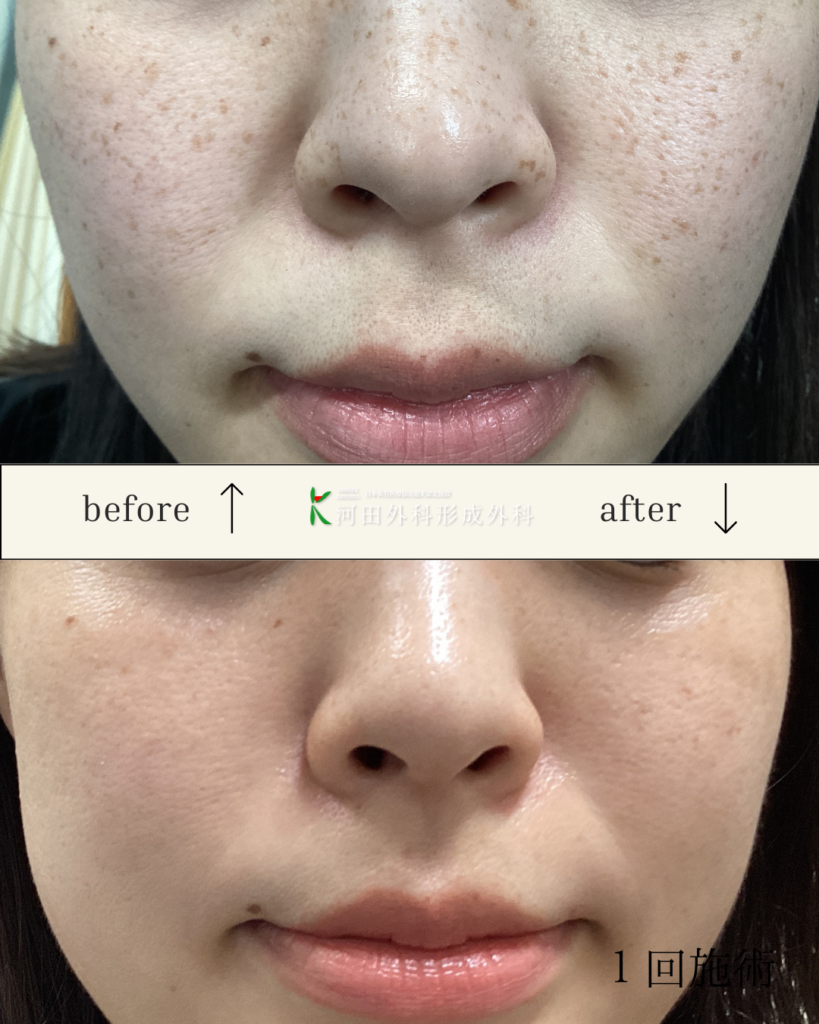 そばかすは、幼少期頃から鼻を中心に左右対称に1~4ミリ程度の小さい斑点が出現します。成長とともに薄くなることもあるが成人以降も残る場合があります。紫外線の影響で悪化しやすいシミです。