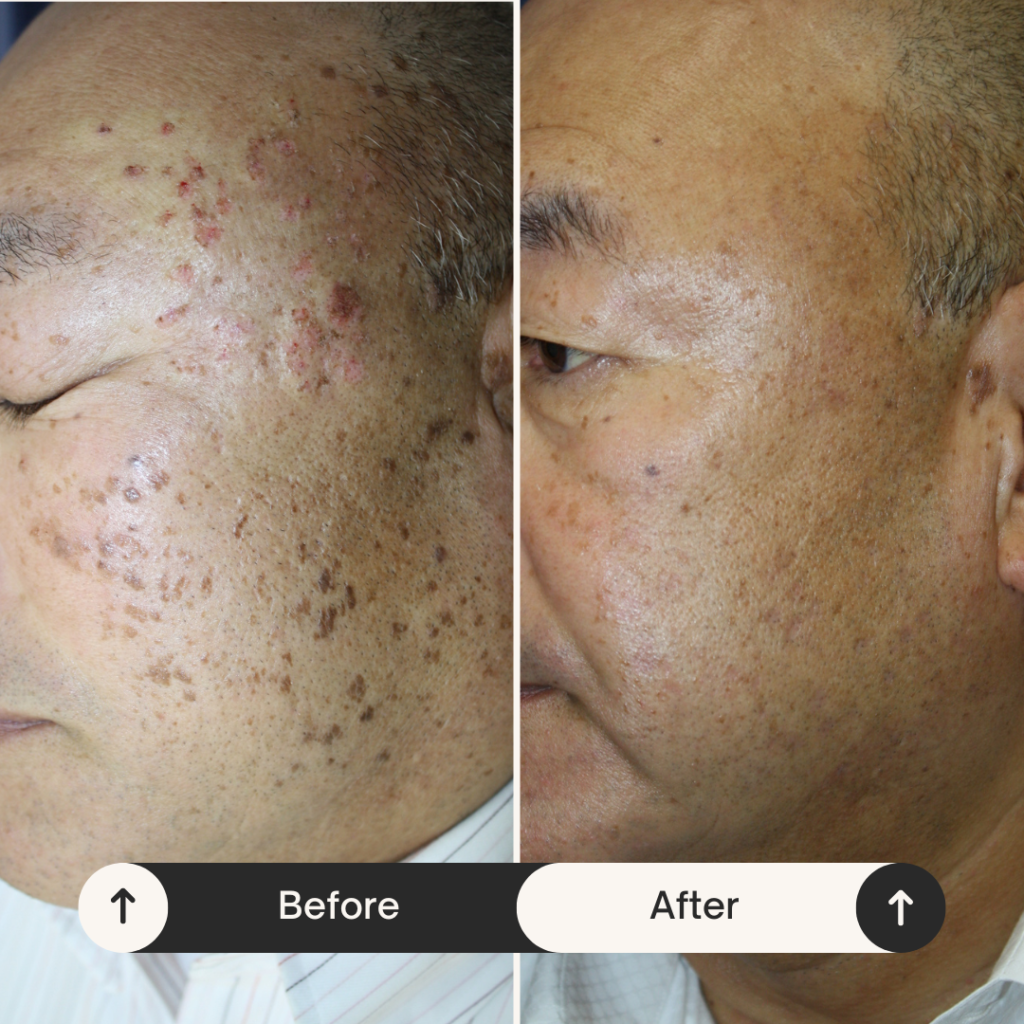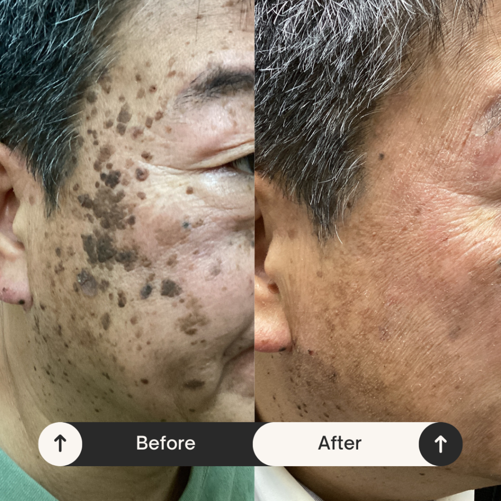 中年以降によくみられ、老人性イボともいわれますが若年からできる方もおられます。頬やこめかみに好発しますが体のどこにでもできます。癌化はなく無害ですが黒いシミが多発したように見えるので気にされる方の多いイボです。